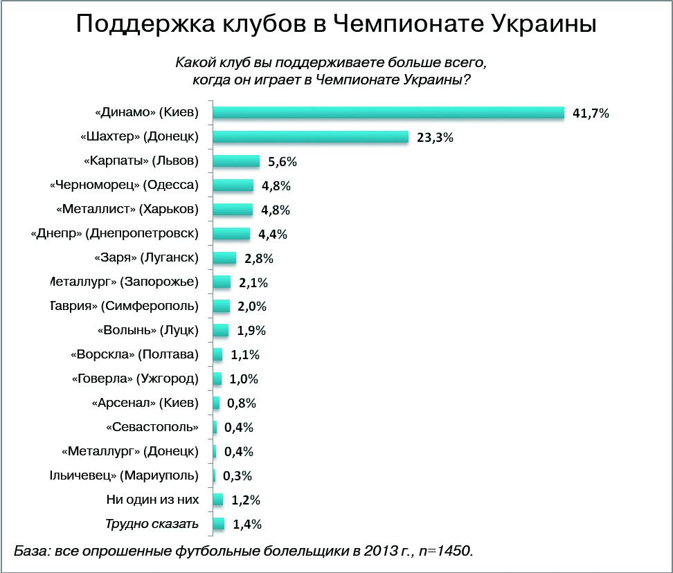 Согласно исследованиям КМИС, самой большой поддержкой болельщиков пользуется киевское "Динамо". 41,7% переживают за него в матчах украинской премьер-лиги (УПЛ), 44,7% - в еврокубковых играх. За ним следует "Шахтер" - 23,3 и 28,7%, соответственно. Любопытно другое: уровень поддержки "бело-синих" за два года существенно не изменился (40,4% - в 2011-м, 41,5% - в 2012-м). А вот у "горняков" тенденция иная. В 2011-м за них болели 30,4% в поединках УПЛ и 36% - в состязаниях евротурниров. В 2012-м - 26,8 и 30,4%. Актуальные показатели - смотри выше. Армия болельщиков "шахты" похудела почти на 7% в матчах УПЛ и примерно на столько же - в соревнованиях под эгидой УЕФА.