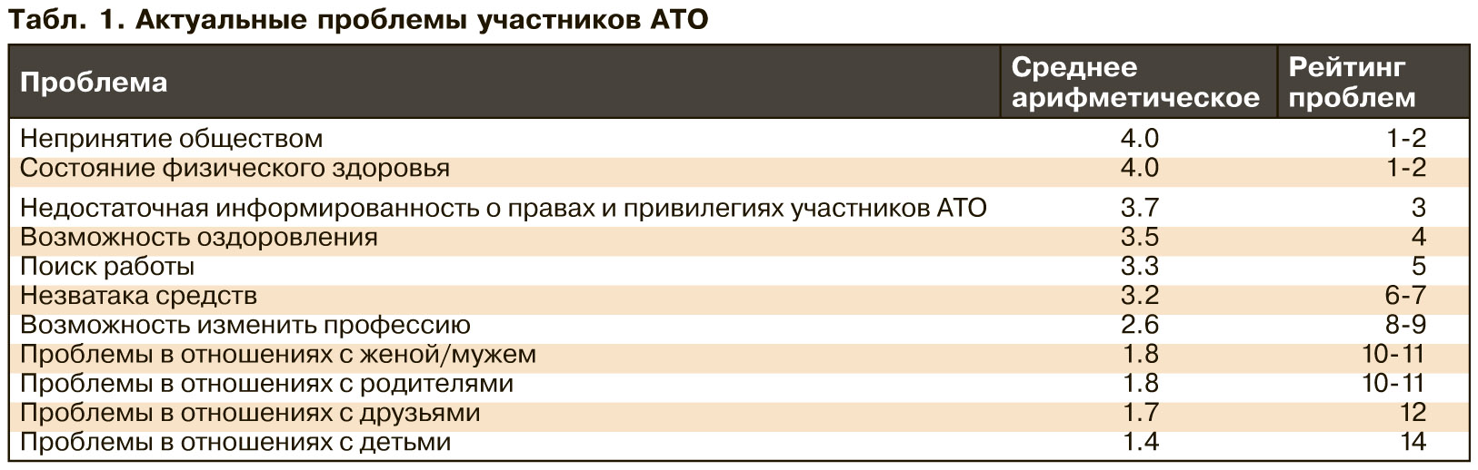 Как видим, в рейтинге проблем, с которыми сталкиваются ветераны АТО, наиболее значимыми являются невосприятие обществом и, собственно, состояние их физического здоровья. Мы полагаем, что с обострением этих проблем одна начинает усиливать другую.