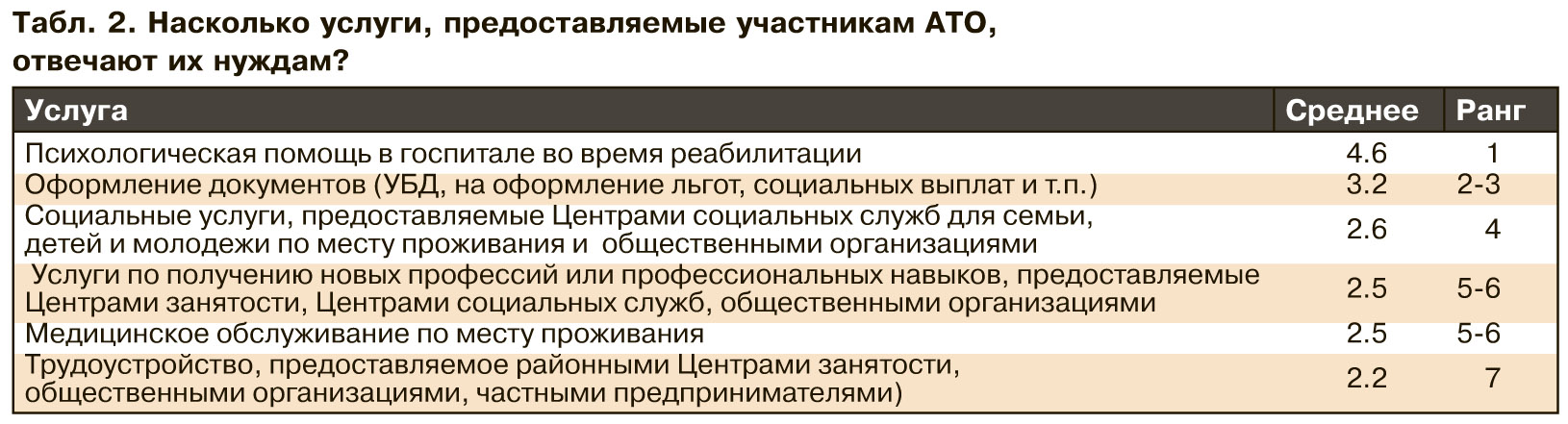 Ответы на вопрос "По вашему мнению, насколько услуги, предоставляемые участникам АТО, отвечают их нуждам?" (см. таб. 2) демонстрируют как очевидность потребности именно в психологической помощи в госпитале во время реабилитации, так и высокую оценку ее соответствия нуждам ветеранов. Следует отметить проблемность, с точки зрения бойцов, медицинского обслуживания по месту проживания, услуг по обучению новым профессиям и трудоустройству, которые предоставляют районные центры занятости, общественные организации, частные предприниматели.