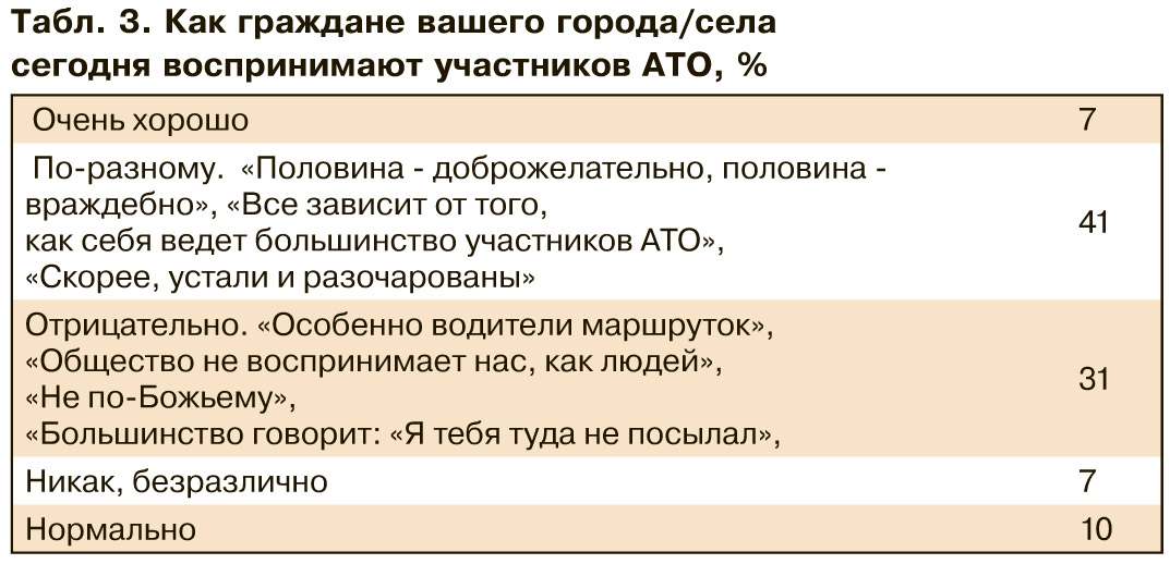 Ветеранам не хватает доброго отношения соотечественников (лишь 7%), которого они как участники боевых действий заслуживают (см. таб. 3). Очень интересен ответ участников АТО относительно в некоторой степени коллективной ответственности самих же участников за отношение к ним окружения. 41% считает, что степень положительного или отрицательного отношения "зависит от того, как ведет себя большинство участников АТО".