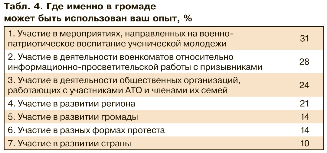 В рамках нашего исследования важна проблематика дальнейших перспектив привлечения участников АТО к активности в громаде (см. таб. 4). Ветераны войны хотят быть эффективными и полезными в мероприятиях, направленных на военно-патриотичное воспитание учащейся молодежи, и в информационно-просветительской роботе военкоматов с призывниками. Насколько нам известно, громады и государство не всегда используют этот мощный общественно-патриотический ресурс.