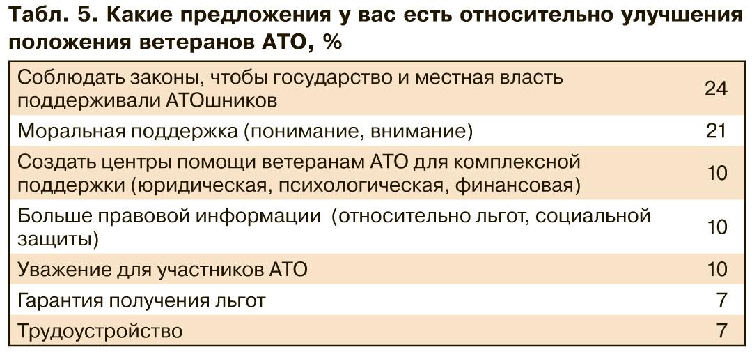 Проведенное исследование подтверждает принципиальное видение ветеранами путей улучшения состояния и положения, в которых они находятся, за счет исключительного выполнения государством и органами местной власти законов, что свидетельствует об ощущении ими определенной социальной несправедливости и несистемности действий и, вероятно, непоследовательности в реализации их прав (см. таб. 5). Есть большая проблема с адекватностью их заслугам перед обществом моральной поддержки, понимания и должного внимания.