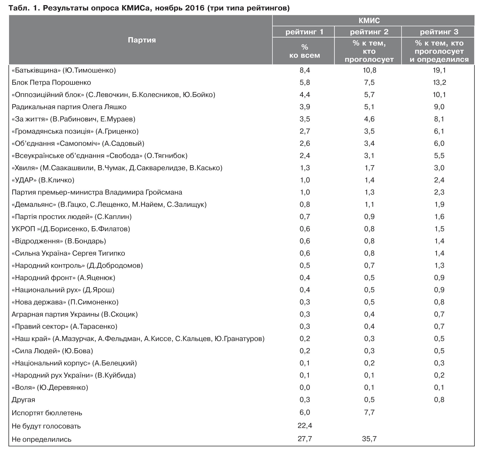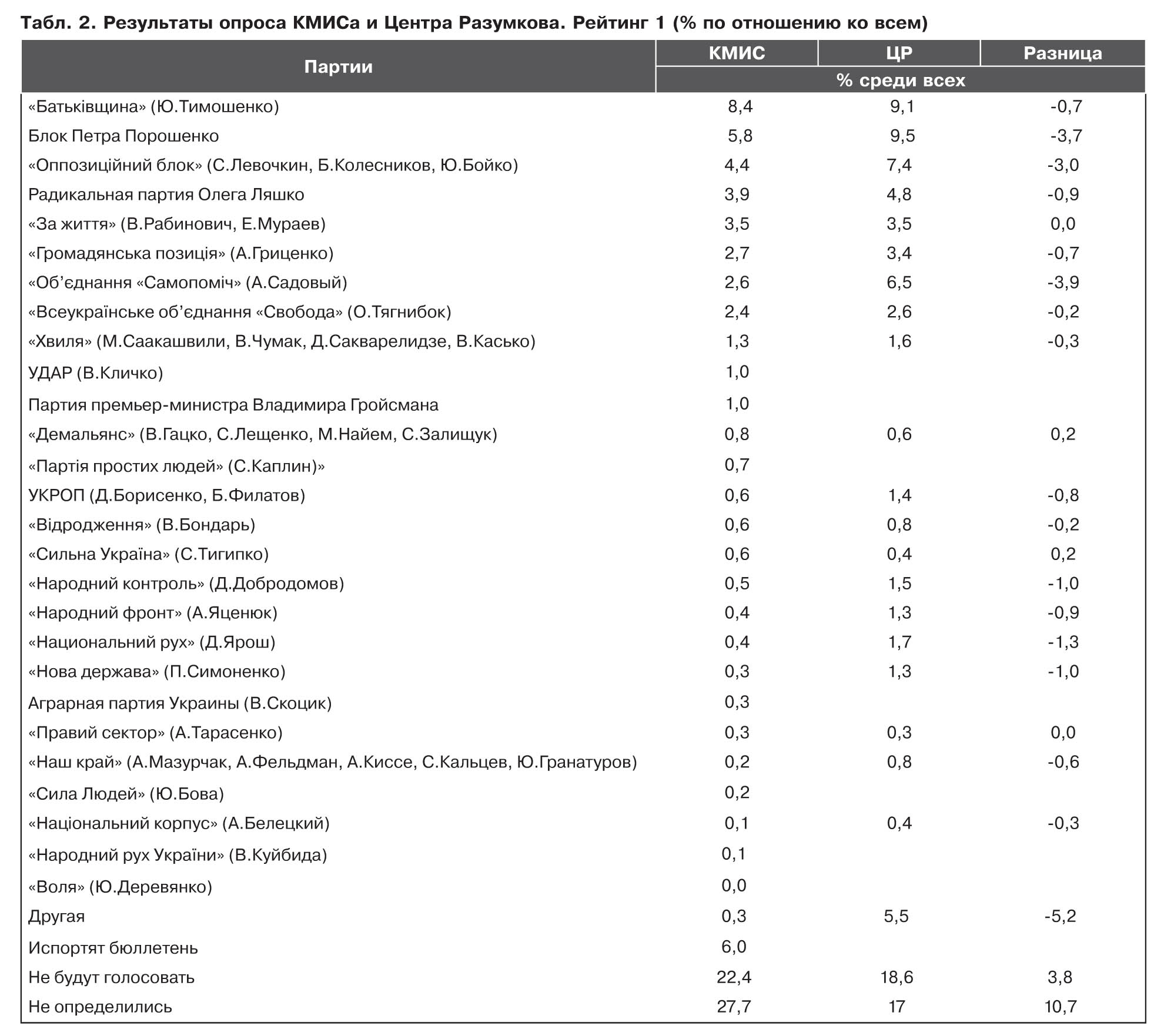 РЕЙТИНГ 2 - процент по отношению к тем, кто сказал, что будет голосовать. Это стандарт представления данных Центра Разумкова или Фонда "Демократические инициативы". Рейтинг 2 (это условное название) уже ближе к показателям, которые партии получили бы на выборах в ближайшее воскресенье, но в полученных данных может быть еще 20–30% тех, кто не определился (в данном случае у КМИСА 22%), то есть сумма процентов голосов за все партии составляет 70–85%, а не 100 (в данном случае 78%). Но на выборах рейтинги партий, по которым рассчитывают проходной балл, в сумме составляют 100%. То есть в среднем при таком способе расчета все проценты могут быть занижены на 15–30%, и если партия на выборах получила бы, скажем, 6%, то при таком опросе и расчете рейтинга 2, он получится меньше 5%, и мы сделаем ошибочный вывод, что она не проходит в парламент. Это может быть критично для некоторых партий. Центр Разумкова в своем пресс-релизе рассчитывает именно рейтинг 2, мы пересчитали таким же образом и данные КМИСа, хотя КМИС в своих пресс-релизах не использует этот рейтинг (см. колонку 2 в табл. 1.)