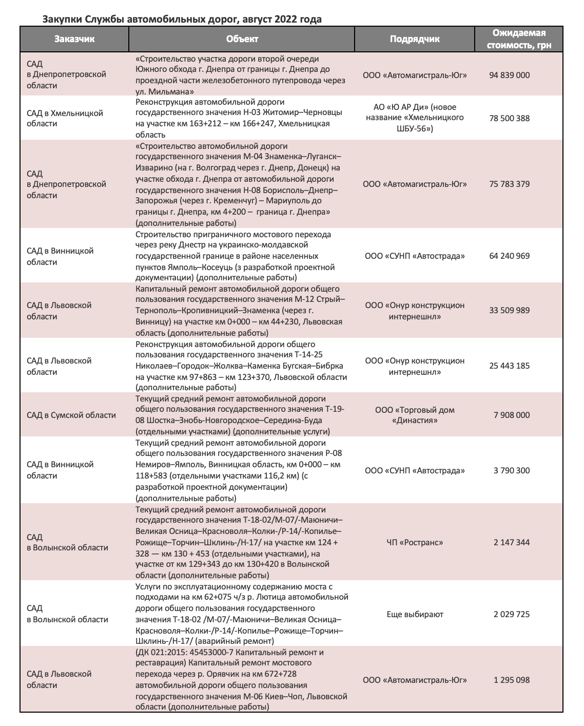 В августе службы автодорог объявили закупки на дорожный ремонт на 390 млн грн. Только одна касается деоккупированной Сумщины. Самые крупные подряды — это большая дорога в пригороде Днепра. Остальное — мосты и дороги, которые не были повреждены врагом (см. табл.). И почти все — тем же фаворитам Укравтодора, которые в последние годы и делили маржу «Большого строительства».