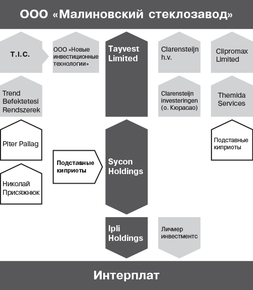 И вот в этом "кооперативе" оказались и наши "киприоты". Дело в том, что один из собственников "Малиновского стеклозавода" - "Tayvest limited" - имеет основателя-киприота: "Sykon Holdings". То есть именно ту кипрскую фирму, которая и породила ООО "Интерплат" - счастливчика, Национальным банком Украины обреченного зарабатывать миллионы ежемесячно до конца времен.