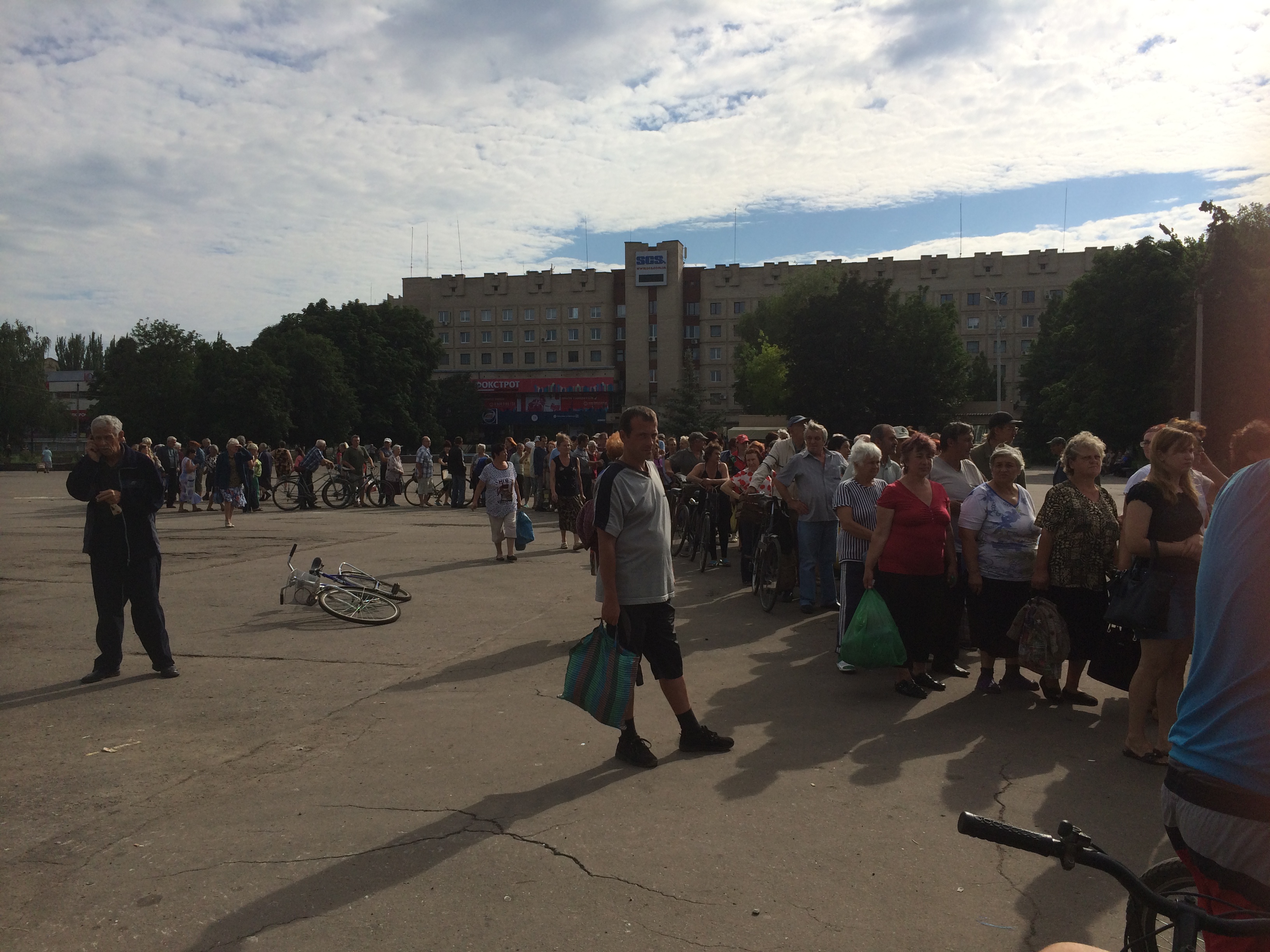Гуманитарную помощь раздают на центральной площади. Скучное стояние в очередях разбавляется дискуссиями по поводу произошедшего.