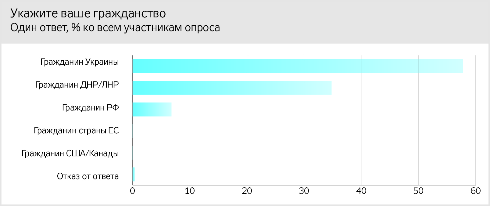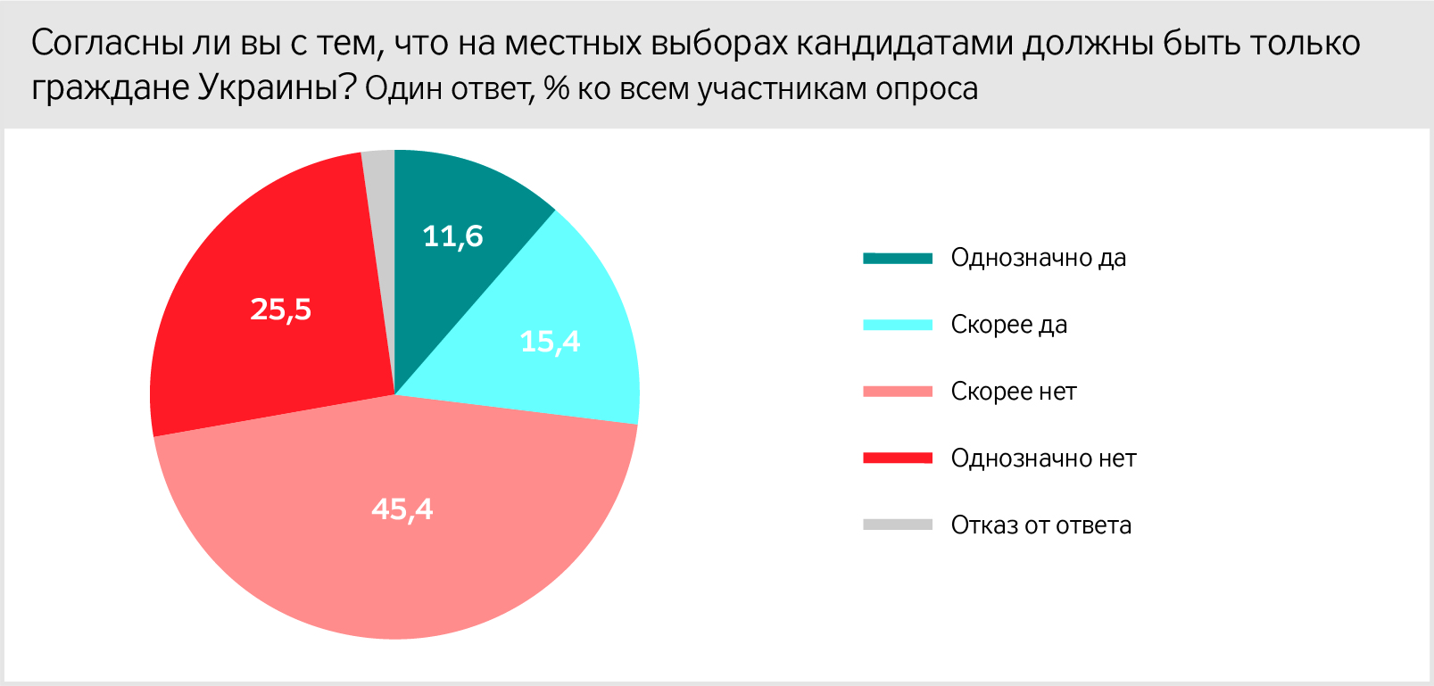 На вопрос "Согласны ли вы с тем, что на местных выборах кандидатами должны быть только граждане Украины?", "однозначно да" ответили лишь 11,6% респондентов. Еще 15,4% колеблются, но все же выбрали графу "скорее да". Однозначно не согласны ограничивать избирательный спектр кандидатов только собственниками паспортов с трезубцем 25,5% участников опроса; еще 45,4% ответили "скорее нет", и таким образом, 70,9% жителей ОРДЛО против того, чтобы на местных выборах кандидатами были только граждане Украины, как это предусмотрено украинским законодательством.
