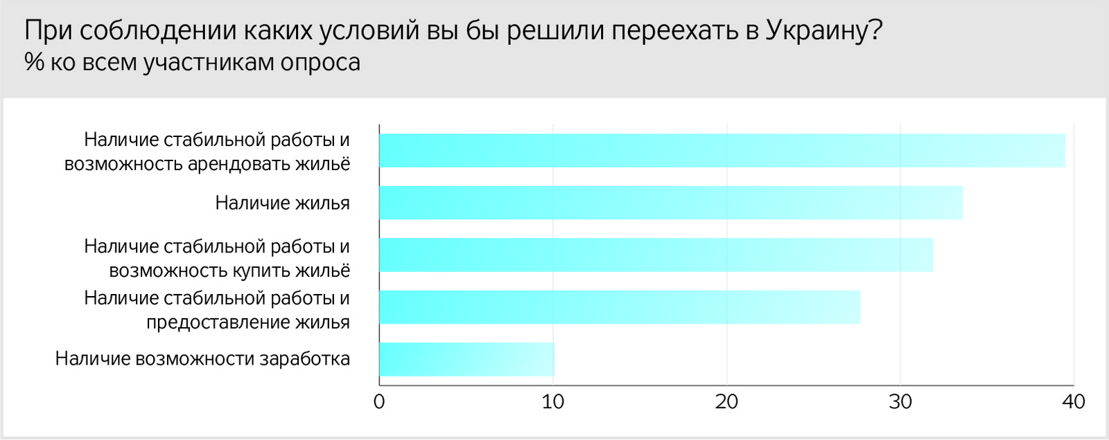 А вот здесь 19,2 процента, думающих о выезде, - колеблются с выбором - куда? Оказывается 11,1% отдают предпочтение России, тогда как Украине - только 5,2%. Но они просто так не поедут. Вторая возможная волна ВПЛ, хоть и достаточно мелкая, однако с четким набором условий.
