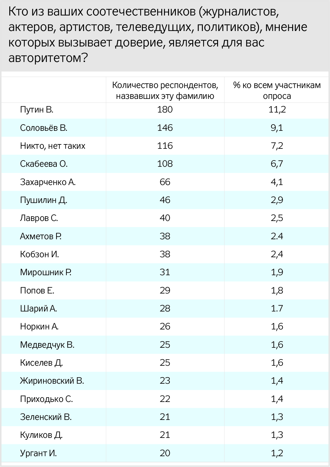 Пытаясь понять, какие путеводные звезды светят жителям оккупированных территорий, социологи "Нью Имидж Маркетинг Групп" предложили респондентам самостоятельно вписать имя того, кто лично для него является лидером доверия. И вот что получилось: