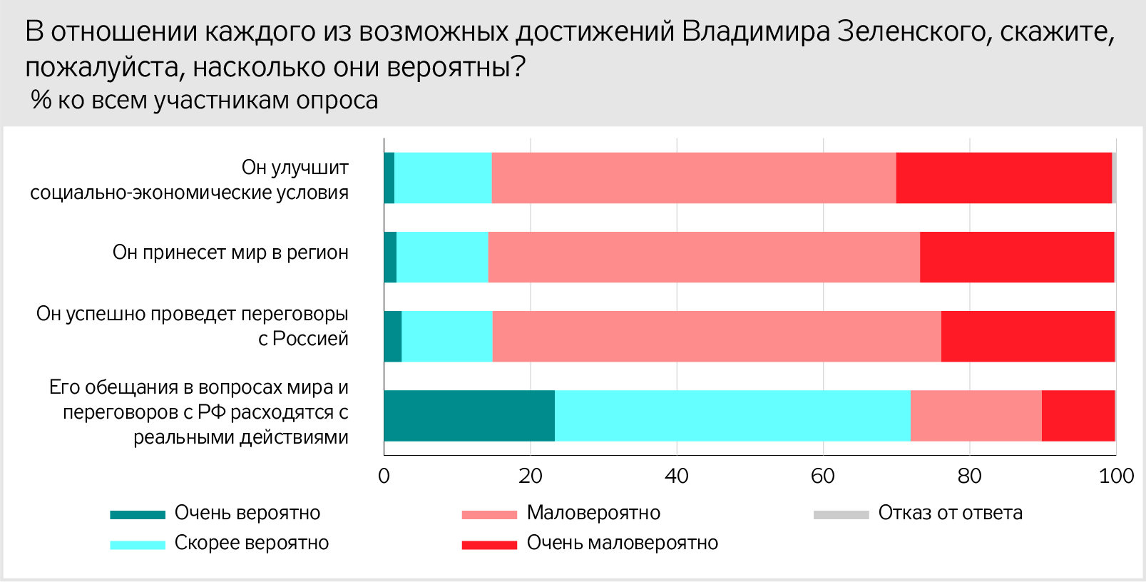 Примерно так же распределились мнения оценивающих способность главы государства провести переговоры с Россией. 2,4 и 12,4% считают, что Зеленский "очень вероятно" и "скорее вероятно" "успешно проведет переговоры с Россией". 61,3% в этом сильно сомневаются. А 23,8% считают успех в переговорах с Путиным "очень маловероятным".