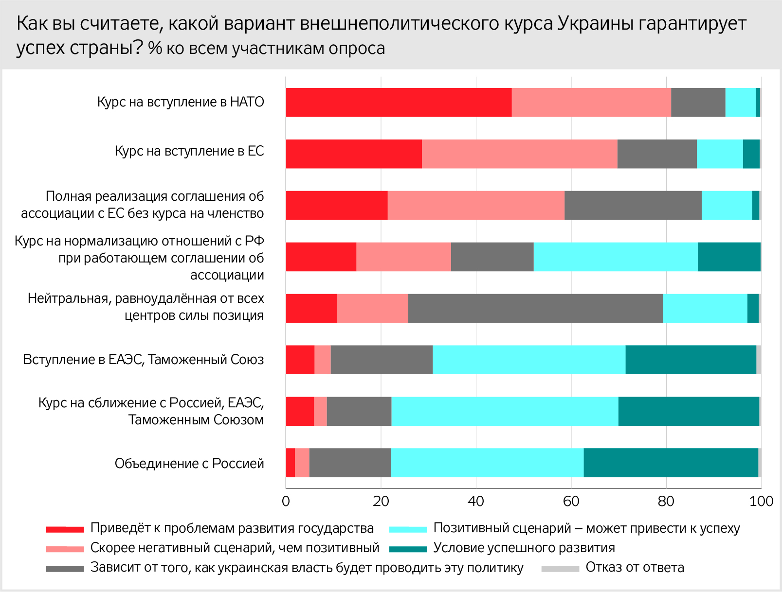 В то же время, каждый пятый респондент полагает, что подобный вариант - скорее негативный сценарий, нежели позитивный. А 14,8% уверены: даже в случае нормализации отношений Украины с Россией действующее Соглашение об ассоциации с Евросоюзом приведет к проблемам развития украинского государства. Зато 17,4% многозначительно отмечают: от украинской политики зависит, насколько будет успешен такой курс.