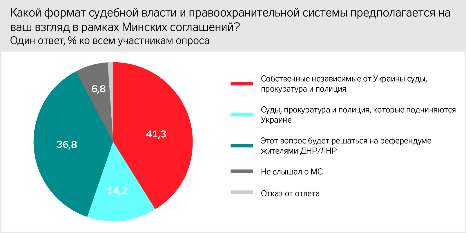 Правоохранительная система. Хотя в составе Украины ныне оккупированные территории Донбасса готовы оставить 18,5% жителей ДНР/ЛНР, тех, кто полагает, что согласно Минским соглашениям правоохранительная система ОРДЛО - суды, прокуратура и полиция - будут подчиняться Украине, еще меньше - 14,2%. За линией разграничения 41,3% опрошенных считают, что "Минск" предполагает для ОРДЛО "собственные, независимые от Украины суды, прокуратуру и полицию", а еще 36,8% считают, что "этот вопрос будет решаться на референдуме жителями ДНР/ЛНР".