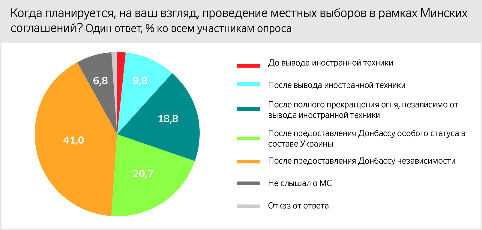 Кстати, любопытно, что на вопрос о том, какой статус должны иметь в будущем территории нынешних ДНР/ЛНР, лишь 16,2% респондентов выразили пожелание видеть их "независимой страной". Но при этом 41% опрошенных считает, что местные выборы, согласно Минским соглашениям, планируются "после предоставления Донбассу независимости", хотя в "Минске" о "независимости" ОРДЛО не говорится вообще.