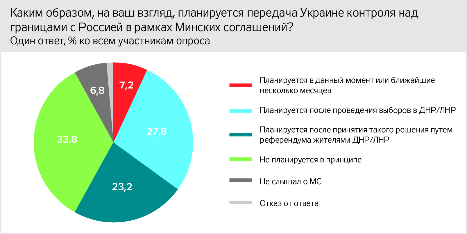 К сожалению, мнение последней группы респондентов отвечает действительности - несмотря на многократные публичные заверения представителей украинской власти (как предыдущей, согласившейся на "Минск", так и нынешней, пытающейся разобраться с непростым "наследством") о том, что выборы в ОРДЛО не могут состояться, пока Украина не контролирует значительную часть своей границы с Россией. На самом деле в соглашении "Минск-2" (официальное название - "Комплекс мер по выполнению Минских соглашений"), подписанном 12 февраля 2015 г. после 16-часового заседания "нормандской четверки" в составе П.Порошенко, А.Меркель, Ф.Олланда и В.Путина, в п.9 предусмотрено "восстановление полного контроля над государственной границей со стороны правительства Украины во всей зоне конфликта, которое должно начаться в первый день после местных выборов и завершиться после всеобъемлющего политического урегулирования…".