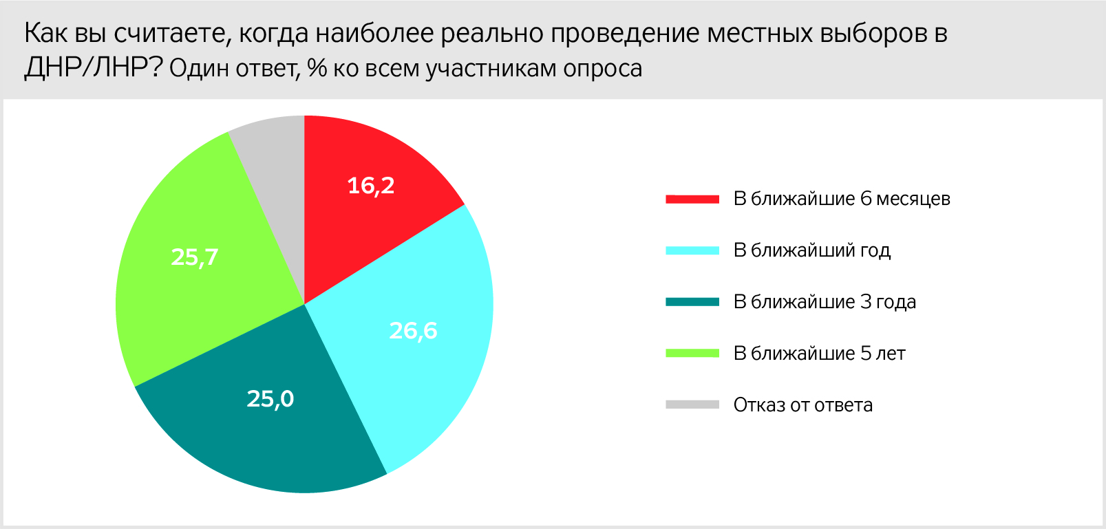 Четверть жителей (25%) "потустороннего Донбасса" считают, что наиболее реально провести эти выборы в ближайшие три года. Еще четверть (25,7%) их земляков видят такую возможность в ближайшие пять лет. Почти столько же (26,6%) жителей оккупированных территорий верят, что выборы возможны в ближайший год. Оптимистов, уверенных, что они смогут прийти к избирательным урнам в течение ближайших шесть месяцев, - 16,2%. Еще 6,5% респондентов затруднились с ответом.