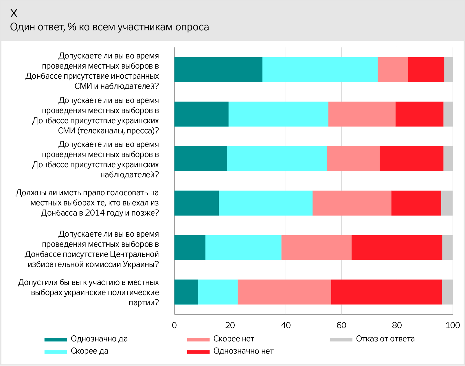 Заметная лояльность на оккупированных территориях была проявлена в вопросах присутствия на выборах украинских СМИ и украинских наблюдателей. Так, готовы допустить украинские медиа отслеживать процесс волеизъявления в Донбассе 55,3% респондентов ("однозначно да" - 19,4%, "скорее да" - 33,7%). Не хотят присутствия украинских журналистов 41,4% опрошенных ("однозначно нет" - 17,3%, "скорее нет" - 24,1%).