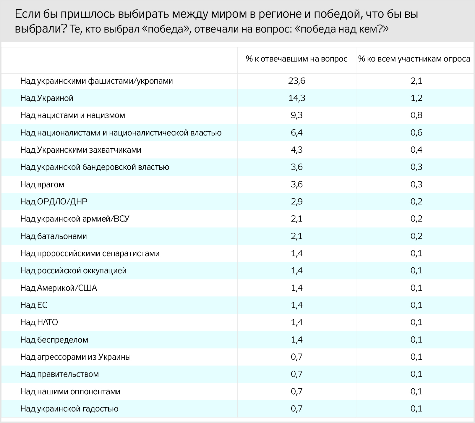 За второй - ненависть, желчь, лють… 90% выбирают между миром и победой - мир. 8% - победу над (ответы в открытом вопросе вписывались самими респондентами) "украинскими фашистами".