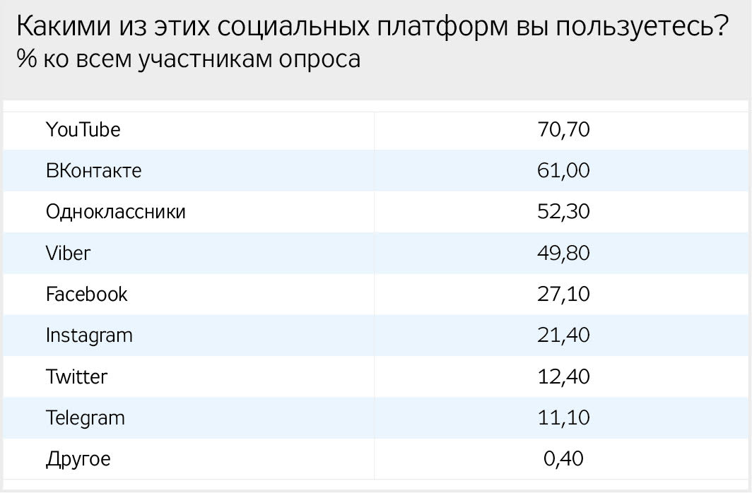 Примечательно, что среди социальных платформ наиболее активно респонденты используют YouTube (70,7%), ВКонтакте (61%), Одноклассники (52,3%), а также Viber (49,8%). Менее популярны Facebook (27,1%), Instagram (21,4%) и Telegram (11,1%).