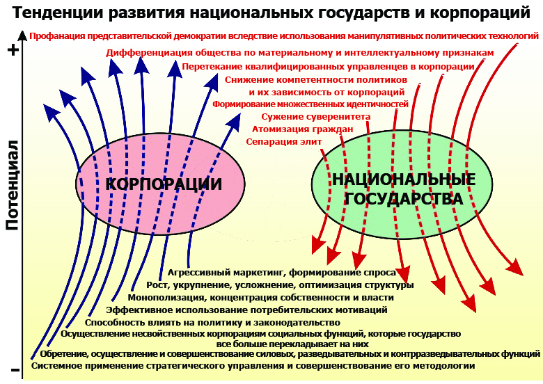 Как видно из схемы, национальные государства находятся в нисходящих трендах, а корпорации (и национальные, и транснациональные) - в восходящих. Это приводит к интенсификации перетекания части государственных функций к корпорациям, где субъектом создания и принятия решений является руководящее ядро в составе малой группы, склонной, согласно "Логике коллективного действия" Мансура Олсона, реализовывать собственные интересы за счет общеобщественных. Очевидно, что практически нереально и нерационально влиять сегодня на уменьшение потенциала корпораций, особенно если речь идет о транснациональных корпорациях. Это возможно только в рамках тоталитарных государств, где вся полнота власти сконцентрирована в руках одного человека. Поэтому целесообразно сосредоточить усилия на преодолении и нейтрализации отрицательных тенденций развития национальных государств с целью существенного повышения их потенциала. Речь идет о кардинальном изменении черт политических партий, органов местного самоуправления, акционерных обществ, кооперативных и других организаций путем их реструктуризации с целью эффективного преодоления "трагедии общего" - для обеспечения их способности в составе больших групп всех своих членов коллективно действовать и эффективно управлять общим ресурсом, которым является символический капитал - авторитет для политических организаций и разного рода ресурсы для органов самоуправления и бизнеса.
