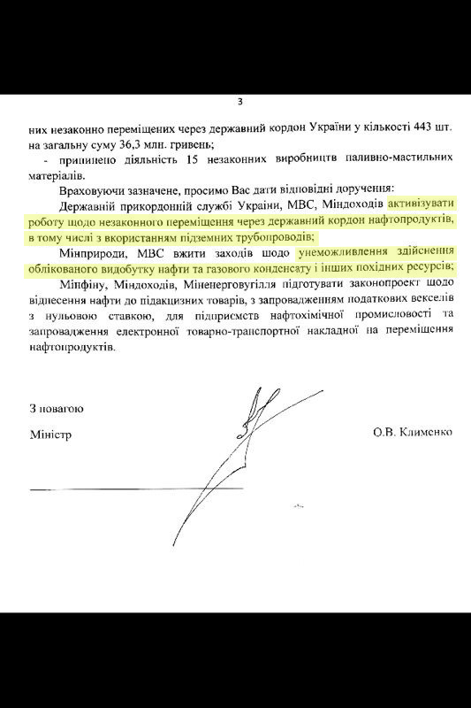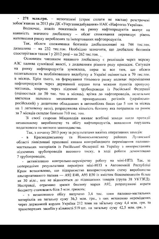 Согласно сопроводительным документам к письму Миндоходов, Николай Азаров указал А. Клименко на персональную ответственность за выполнение утвержденных показателей по уплате налогов и сборов в соответствии с показателями закона о госбюджете на 2014 г. Премьер-министр потребовал в октябре 2013 г. доложить о результатах мер принятых к обеспечению поступлений акцизного налога с нефтепродуктов в полном объеме.