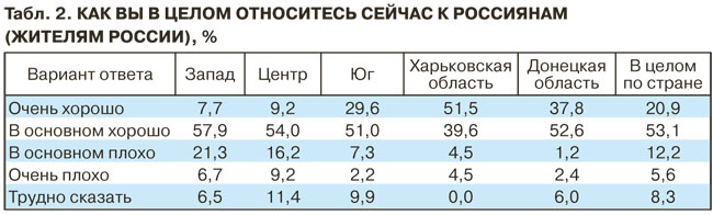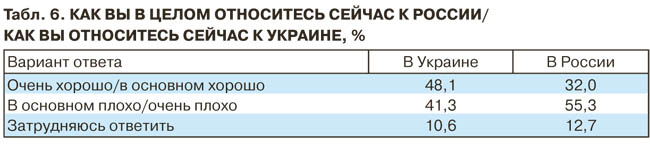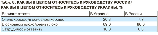 А в России положительно относятся к жителям Украины только 60% населения. И еще наблюдается существенная разница в отношении к руководству двух стран: в Украине 21% населения положительно относятся к руководству России - конечно, в основном за счет восточных областей, - а в России к руководству Украины позитивно расположены всего 7,7% населения.