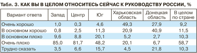 И еще несколько цифр: в Донецкой области хорошо и очень хорошо относятся к России 84,3%, к россиянам - 90,4%, к руководству России - 68,8%. В Харьковской области эти цифры составляют 79,9, 91 и 70,1% соответственно.