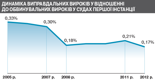 Мыслимо ли, что в свободной стране, где проповедуется верховенство права, президент призывает и, по сути, дает поручение увеличить количество оправдательных приговоров? Подтверждает ли это то, что судебная система находится в ручном режиме? Точно - не опровергает. В своих словах о 2–3 процентах Виктор Янукович говорил о тысячах людей и десятках тысяч судеб, ведь приговор среднестатистическому подсудимому затрагивает будущее еще 3–4 членов его семьи. Но, даже говоря о таких мизерных процентах, президент крупно ошибался. Обратите внимание на реальные проценты оправдательных приговоров (см.диагр.).