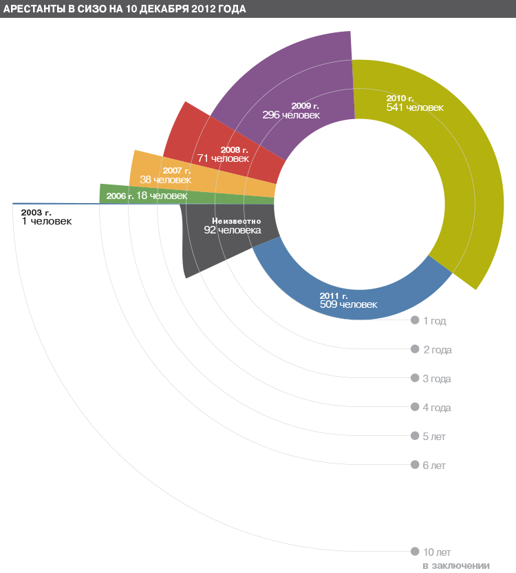 Вернемся к иллюстрации. Дело Оксаны Елисеевой судами рассматривается уже более трех лет. Предположим, что через полгода суд первой инстанции вынесет обвинительный приговор, и дело отправится на рассмотрение в апелляционную инстанцию. На это уйдет еще около года. Как минимум, еще полтора года тюремных условий - это будущее большинства арестантов из указанного списка.