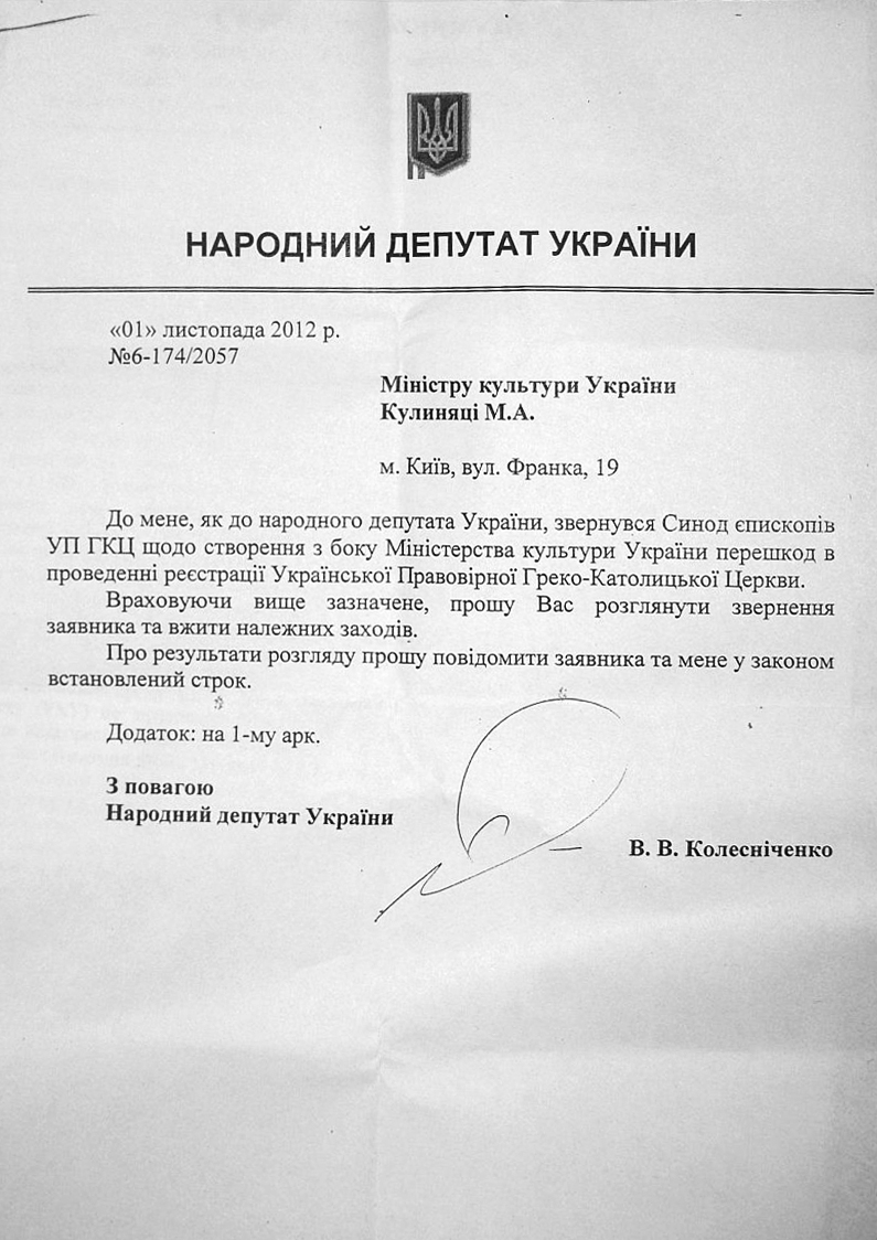 Любопытно, что из всего депутатского корпуса прошлого созыва в "заступники" священноначалие УП ГКЦ выбрало именно одиозного "защитника от украинского" В.Колесниченко. Именно ему "отцы" высказали свою обиду, поделились наблюдениями и выступили с предложением. В небольшом, но емком письме много любопытного: оценка деятельности чиновников Министерства культуры и Львовской ОГА, а также "масонов", прессы и, конечно, священноначалия УГКЦ. Деятельность эта, как легко догадаться, направлена на борьбу против УП ГКЦ и одновременно и неотъемлемо - с действующей властью. Из чего легко заключить, кто на самом деле в этом "проблемном" для власти регионе истинный союзник власти или, во всяком случае, готов им стать в обмен на небольшую услугу. Указанная услуга, впрочем, в интересах власти, о чем вполне недвусмысленно сообщает в письме депутату владыка УП ГКЦ Маркиян Гитюк: "Православную церковь Министерство культуры по политическим мотивам делит и регистрирует 5 православных церквей, а для Греко-Католической Церкви УГКЦ искусственно удерживает монополию, чтобы она могла и политически манипулировать общественностью".