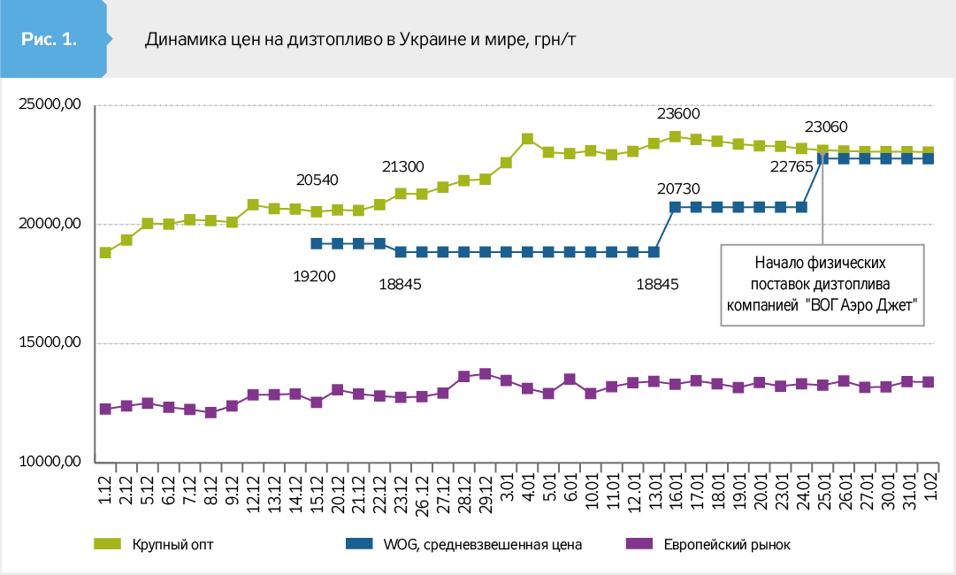 25 января 2017 г. ЦОП заявил о повышении закупочных цен на дизельное топливо по требованию компании "ВОГ Аэро Джет". Железнодорожники взяли под козырек, в результате чего дизтопливо подорожало почти на 20%, или на 4000 грн/т по сравнению с ценой, обещанной трейдером на тендерах 15 и 22 декабря 2016 г..