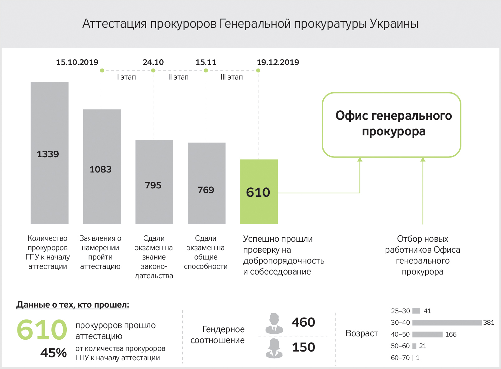 За два с половиной месяца проведено тестирование на знание законодательства, общие способности, способность решать практические задачи, проведена проверка на добропорядочность прокуроров. С целью обеспечить прозрачность и беспристрастность процесса к работе кадровых комиссий привлечены внешние наблюдатели, представлявшие не менее половины состава таких комиссий.