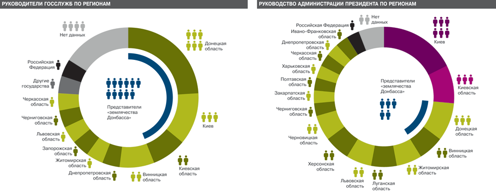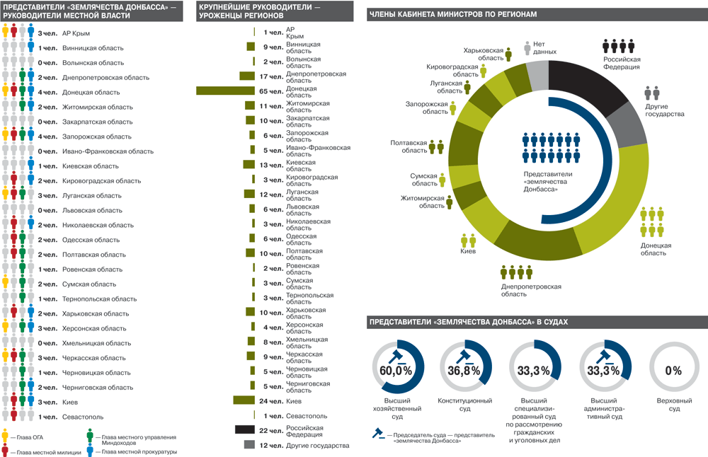 В принципе, изучая присутствие "донецких" во власти достаточно было бы поверхностного взгляда. К донбасскому землячеству в Украине относятся: президент, премьер-министр, два вице-премьера, глава парламента, секретарь Совета нацбезопасности, глава Нацбанка, генпрокурор и главы четырех самых значимых судов, включая Конституционный. Расценить подобное положение дел иначе, нежели отказ в доверии к местным элитам других регионов Украины невозможно. Причем, речь идет не только о, в большинстве своем, оппозиционных западных регионах, но и об электорально президенту близких - Харькове, Одессе, Крыме, Запорожье... Более того, этим самым близким не доверяют даже управление собственными малыми родинами... Но это - лишь верхушка айсберга 300-тысячного украинского штата чиновников.