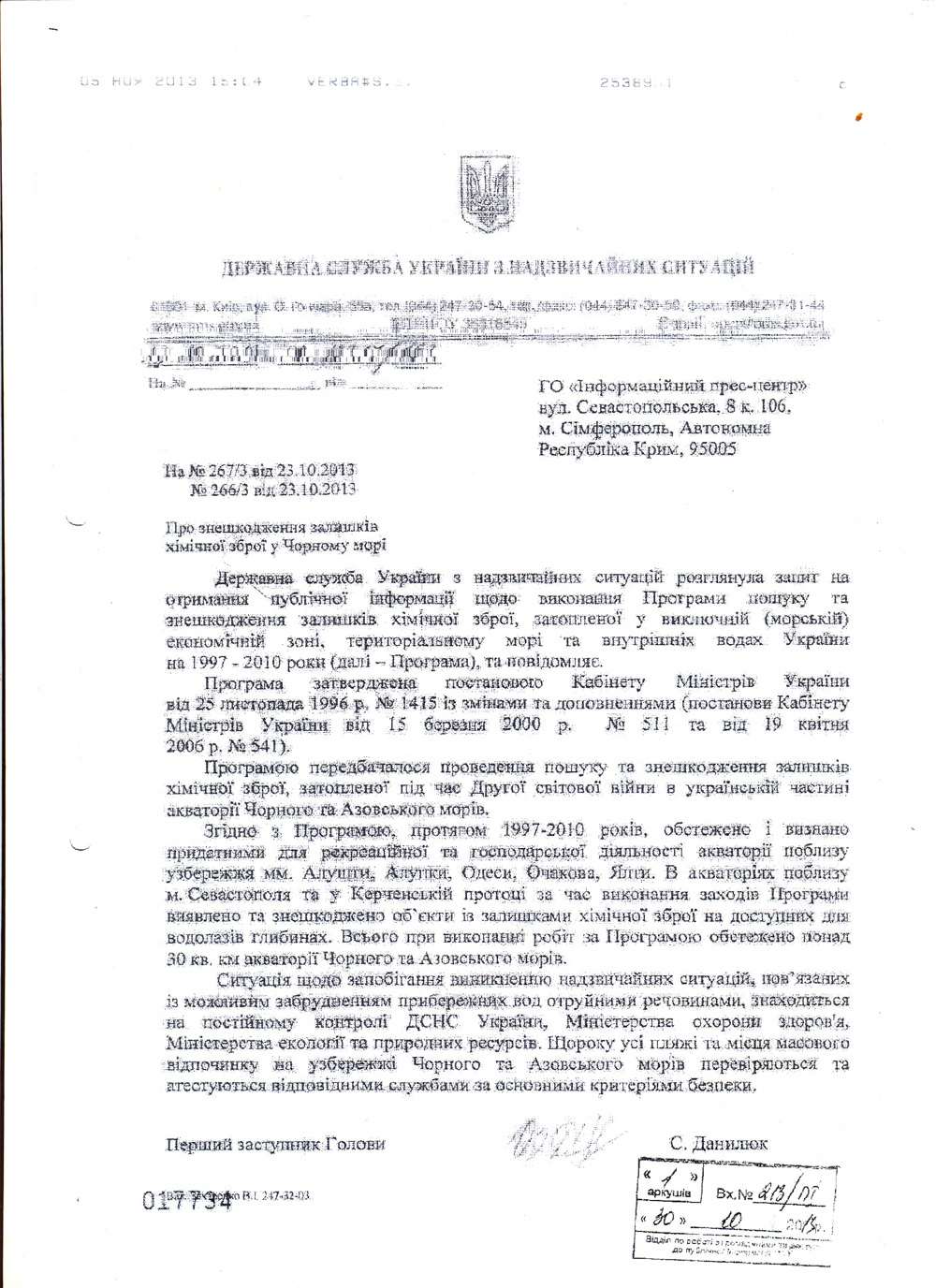 Заметим, что ни один из опубликованных документов никем не был поставлен под сомнение, и ни один из приведенных в них фактов не был опровергнут. В отличие от слов отдельных должностных лиц, убеждавших общественность в том, что ситуация под контролем, а контейнеры с химоружием находятся за 12–15 км от берега на глубине 150 м. Это заявление бывшего начальника крымского главка МЧС Недобиткова два года спустя было опровергнуто: в эфире "5 канала" начальник департамента реагирования на чрезвычайные ситуации Госслужбы по ЧС Григорий Марченко сообщил, что таких данных у них нет.