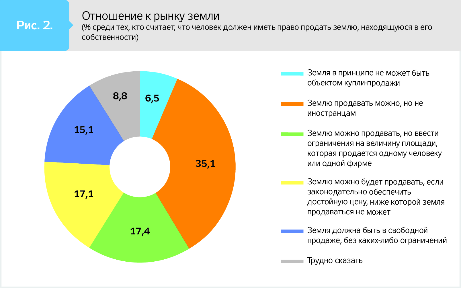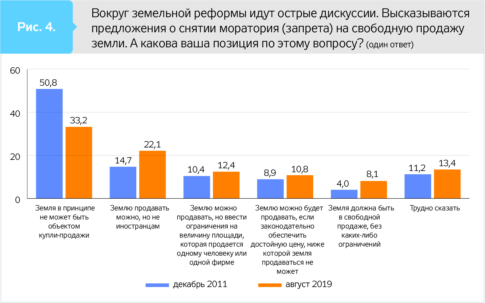 Как видно из сравнения данных опросов Фонда "Демократические инициативы", уменьшилось количество тех, кто принципиально отрицает возможность купли-продажи земли. Однако в исследовании 2019 г. этому вопросу предшествовал другой: "Как вы считаете, должен ли человек, имеющий в собственности землю, иметь право ее продать?",― который мог для части граждан перевести проблему купли-продажи земли в плоскость права человека свободно распоряжаться собственностью и таким образом повысить их готовность рассматривать куплю-продажу земель в определенном виде. Что же касается 2011 г., то вопрос о праве распоряжаться собственностью не ставили, что и могло обусловить сравнительно большую долю тех, кто отрицал рынок земли в любом варианте.