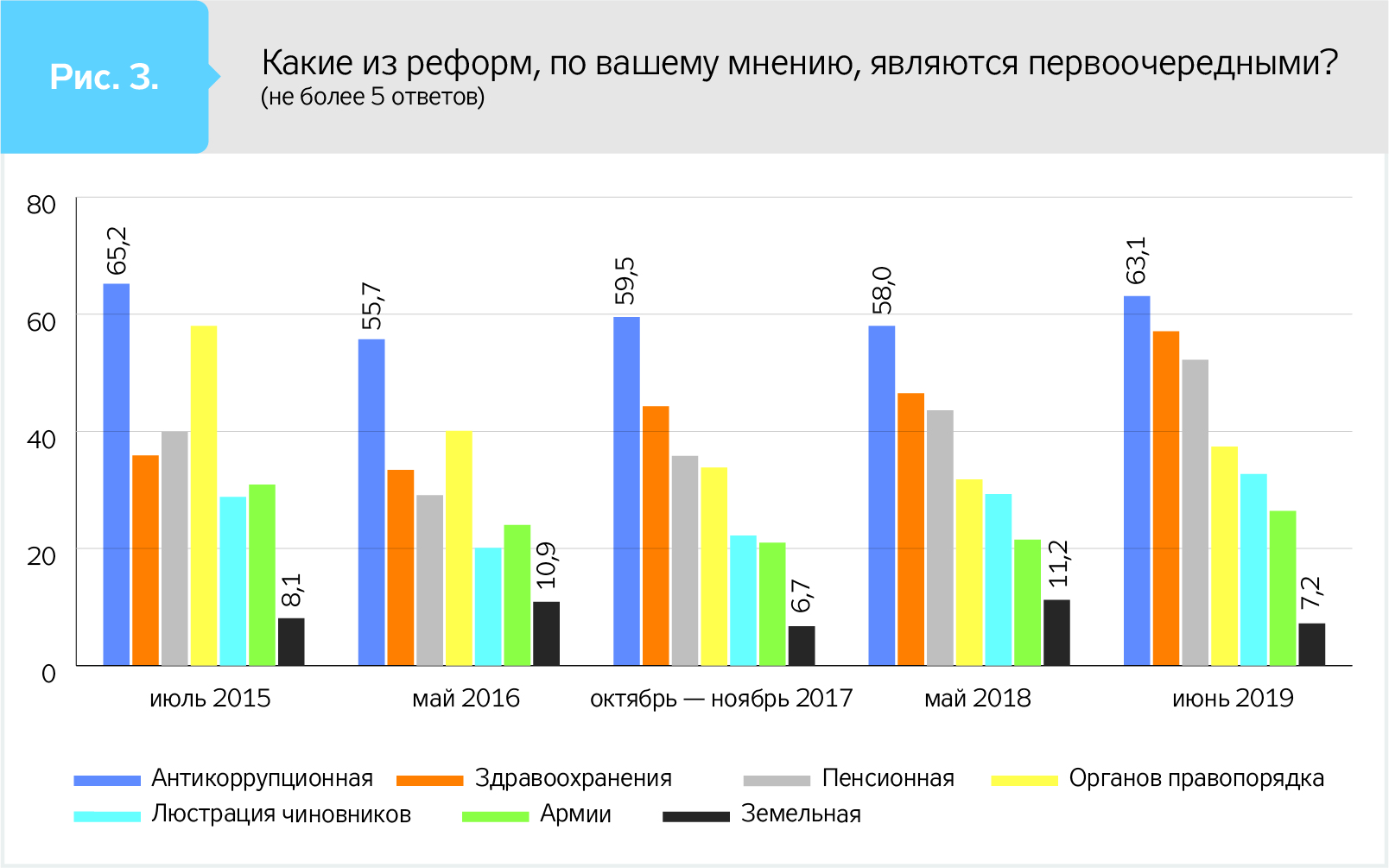 Несмотря на актуальность проблемы, граждане не воспринимают земельную реформу как одну из первоочередных. Ежегодные мониторинговые опросы, проводимые Фондом "Демократические инициативы", показывают, что по крайней мере на протяжении последних пяти лет лишь 7–10% граждан считают земельную реформу первоочередной, причем не наблюдается существенных трендов к изменению восприятия ее важности.