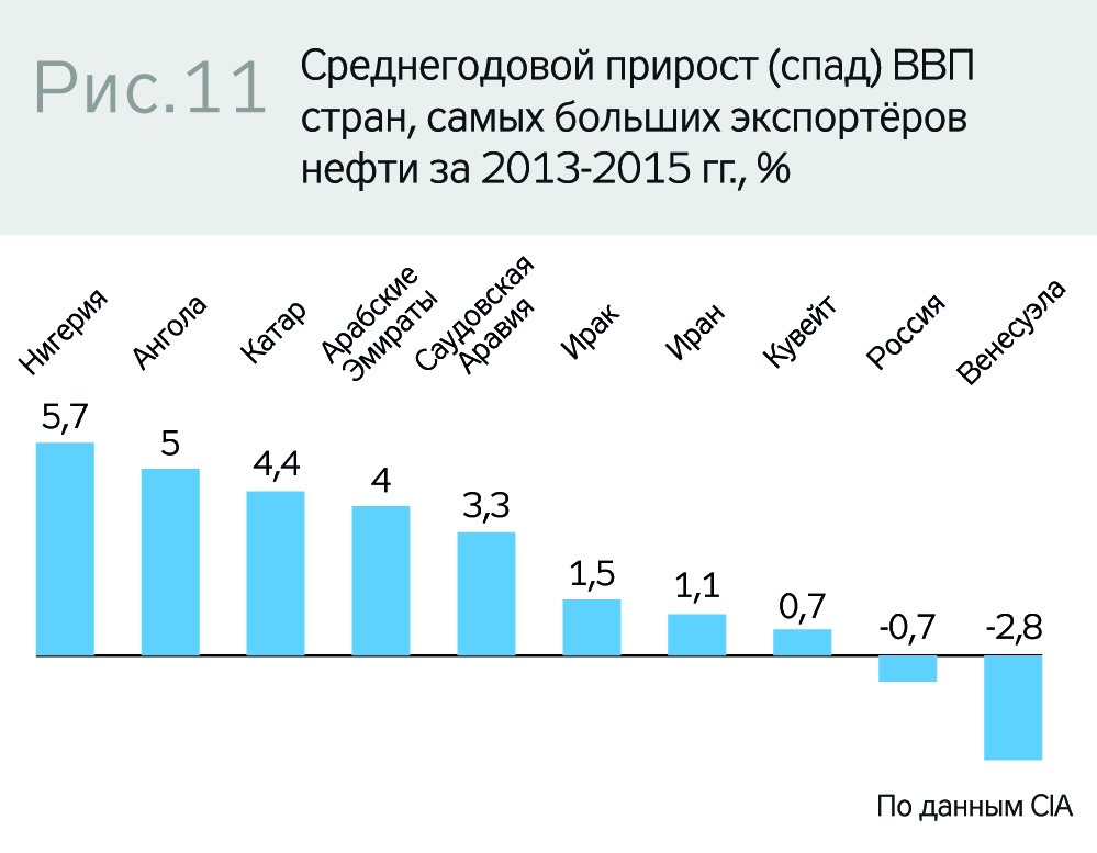О негативном влиянии энерго-сырьевой структуры экономики России свидетельствует сравнение динамики ее развития с другими странами - крупнейшими экспортерами нефти, на которые приходится до 60% мирового экспорта нефти. В этой группе стран у России, вслед за Венесуэлой, - наихудшая динамика ВВП.