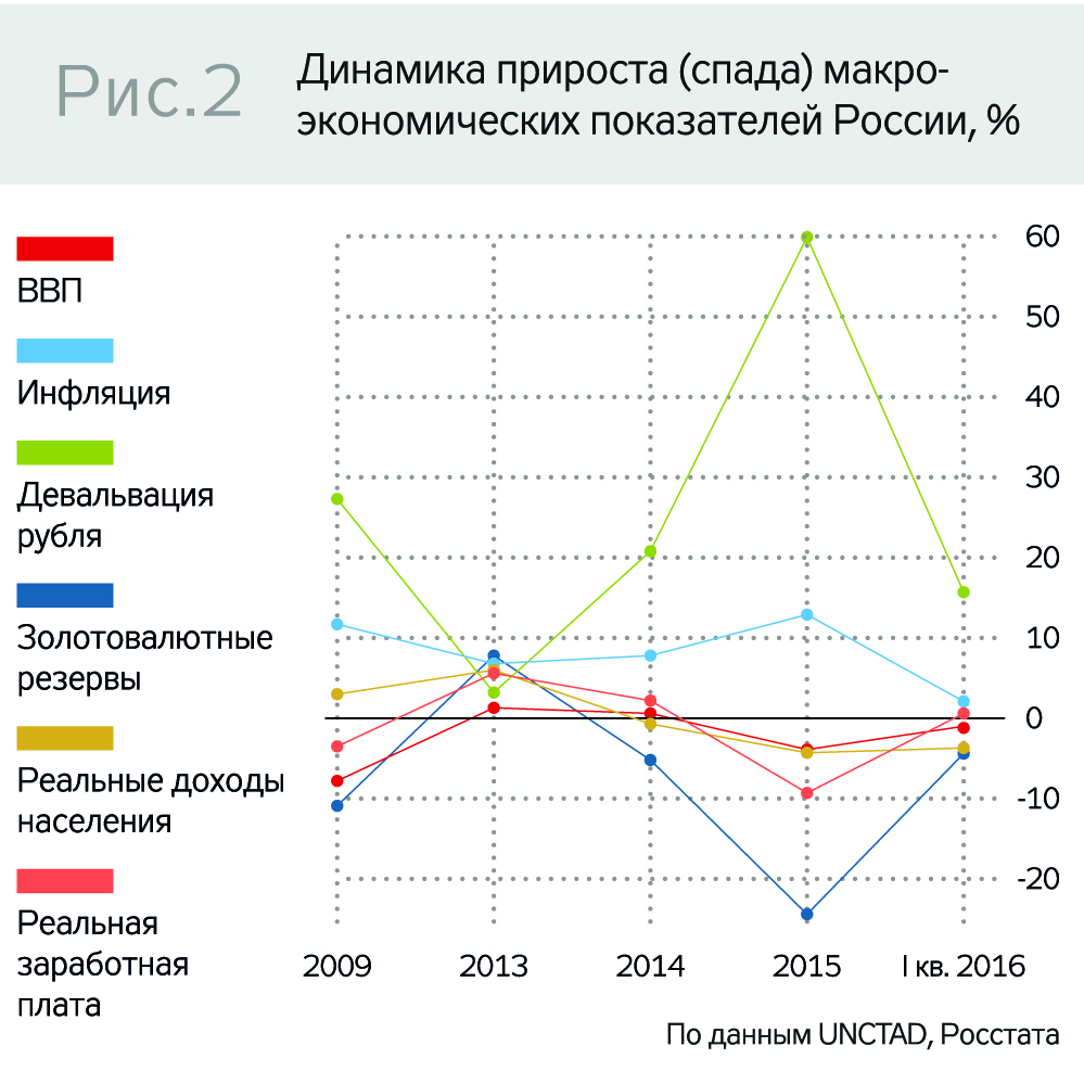 Фактов, что российская экономика является структурно деформированной, энерго-сырьевой, тоже более чем достаточно. Половина бюджета России формировалась за счет нефтегазовых доходов, в т.ч. 74% - за счет роста цен. В 2015–2016 гг. бюджет столько же недополучил от снижения цен. И это оказывает очень негативное влияние на платежный баланс, государственный бюджет, валютный курс, инфляцию и т.п.