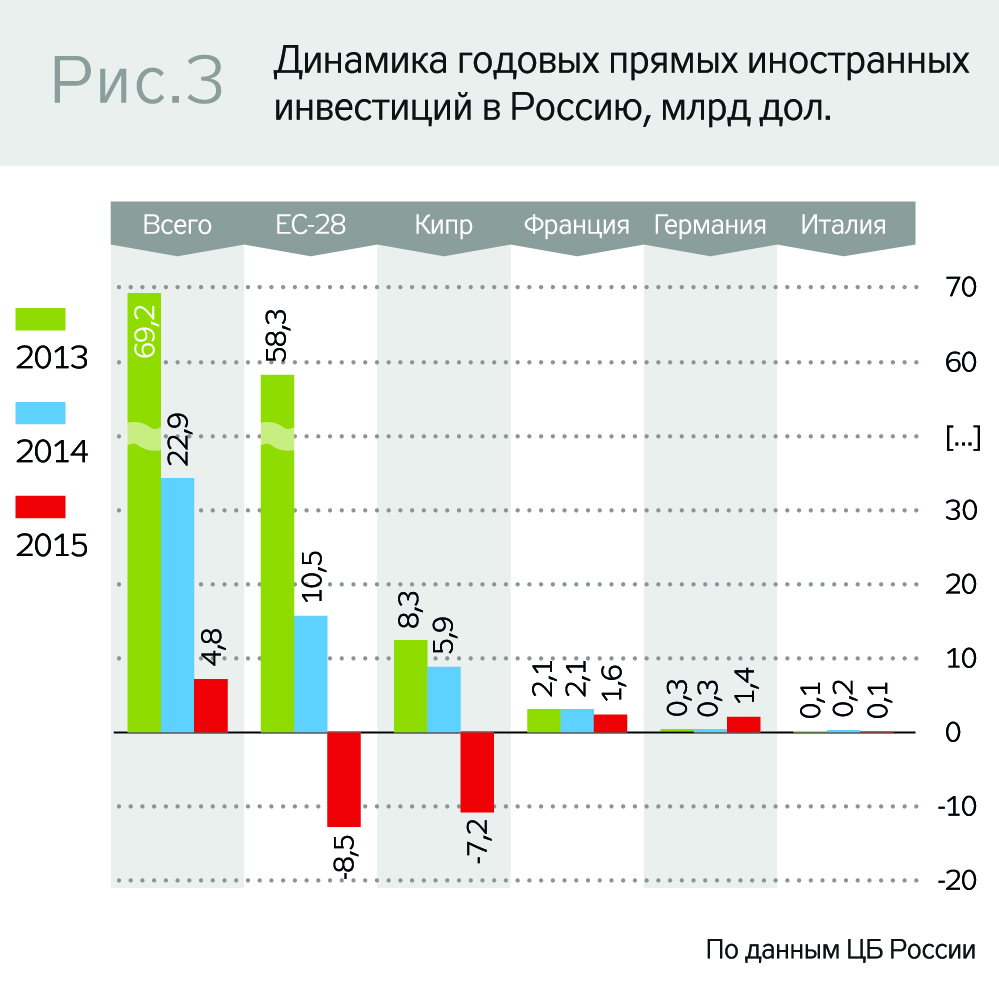 Так произошло и в России. За 2014–1015 гг. по сравнению с 2013 г. объем прямых иностранных инвестиций сократился в 14,5 раза. Ситуация с европейскими инвестициями еще более катастрофична. Если в 2013 г. из ЕС было привлечено 58,3 млрд долл., то в 2015 г. - изъято 8,5 млрд долл. Но если вникнуть в структуру по странам, приоткрывается любопытная картина. Почти 90% изъятых инвестиций (-7,2 млрд долл.) приходится на Кипр, в сущности, оффшоризованный российским капиталом. Иными словами, это санкции российских инвесторов против России. Что же касается ведущих стран ЕС, определяющих его внешнюю политику (Германия, Франция, Италия), то здесь нет ни изъятия, ни даже сокращения. То же самое касается США и Китая.