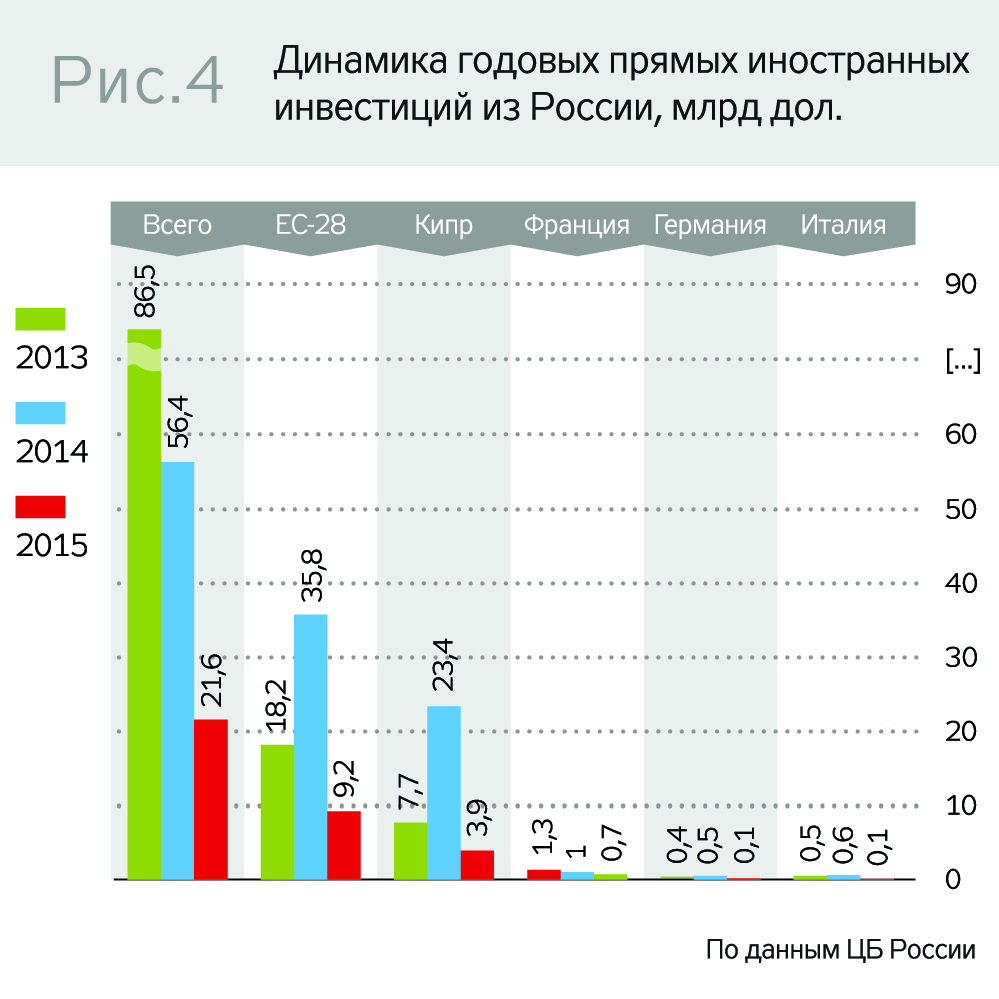 2015 гг. резко возросли официальные прямые иностранные инвестиции из России в другие страны. То есть российские инвестиции уходят из страны. За эти годы, впервые после кризиса 2009 г., отток инвестиций в разы превышал приток (см. рис. 4, в сравнении с рис. 3).