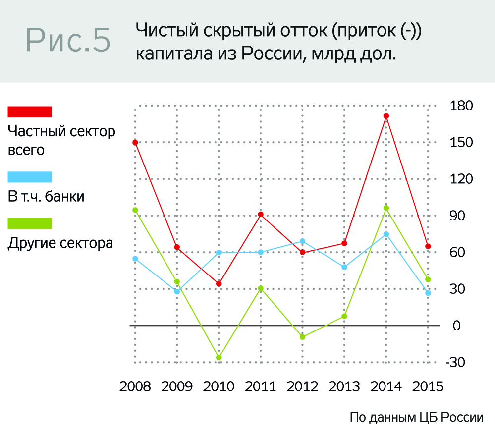 Но самое драматичное то, что резко возрос неофициальный (скрытый) отток (бегство) российского капитала. В 2014 г. "сбежало" 153 млрд долл., что на 93 млрд долл. больше, чем в 2013-м.