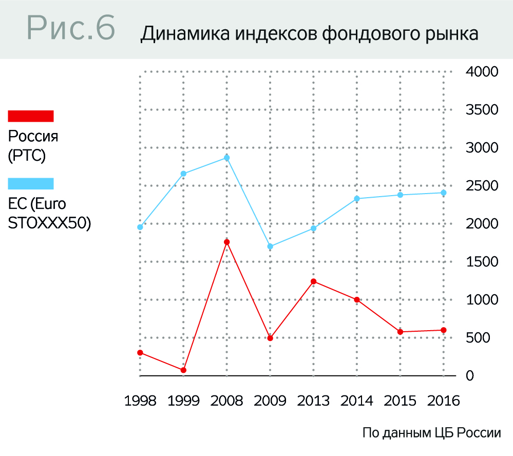Фондовый рынок России просел вдвое, но в 2016-м несколько стабилизировался. Тем не менее, потери позиций фондового рынка больше, чем за годы кризиса 1998 и 2009 гг.. Однако и здесь не обошлось без манипуляций. В 2016 г., впервые после введения санкций, Россия выпустила долларовые облигации. Кремль хотел засвидетельствовать присутствие России на мировых финансовых рынках, а заодно пополнить бюджет. Однако западные и азиатские банки в размещении участия не приняли. Это стало унижением для России. Для того чтобы найти достаточное количество инвесторов, была предложена высокая доходность (процент) и продлен срок размещения. Планировалось привлечь 3 млрд долл., но когда облигации, в конце концов, разместили, биржи не проявили к ним никакого интереса.