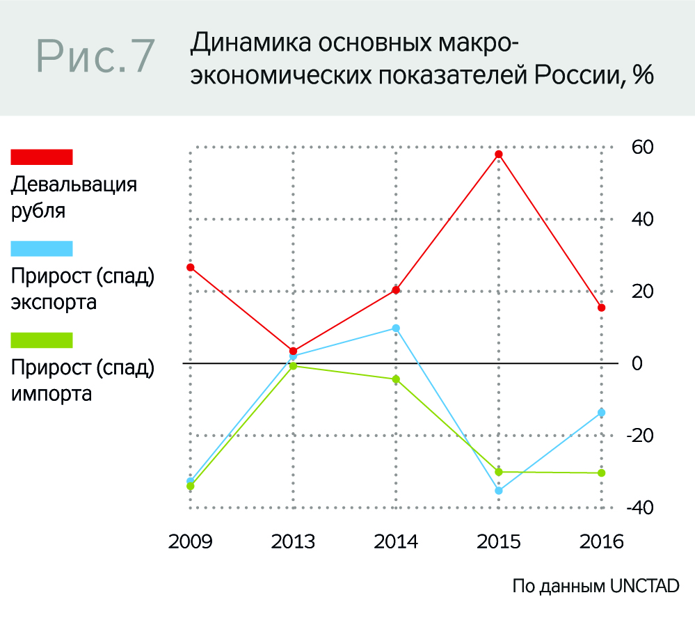 Структурное влияние санкций на спад торговли России с ЕС было незначительным. Значительно больший эффект имели встречные санкции России против импорта товаров из стран ЕС. Но еще большее влияние оказало падение покупательной способности из-за обвала курса рубля. Это подтверждает тот факт, что в 2009 г., когда никаких санкций не было, даже вдвое меньший спад курса рубля вызвал аналогичный спад внешней торговли, особенно импорта из Европы.