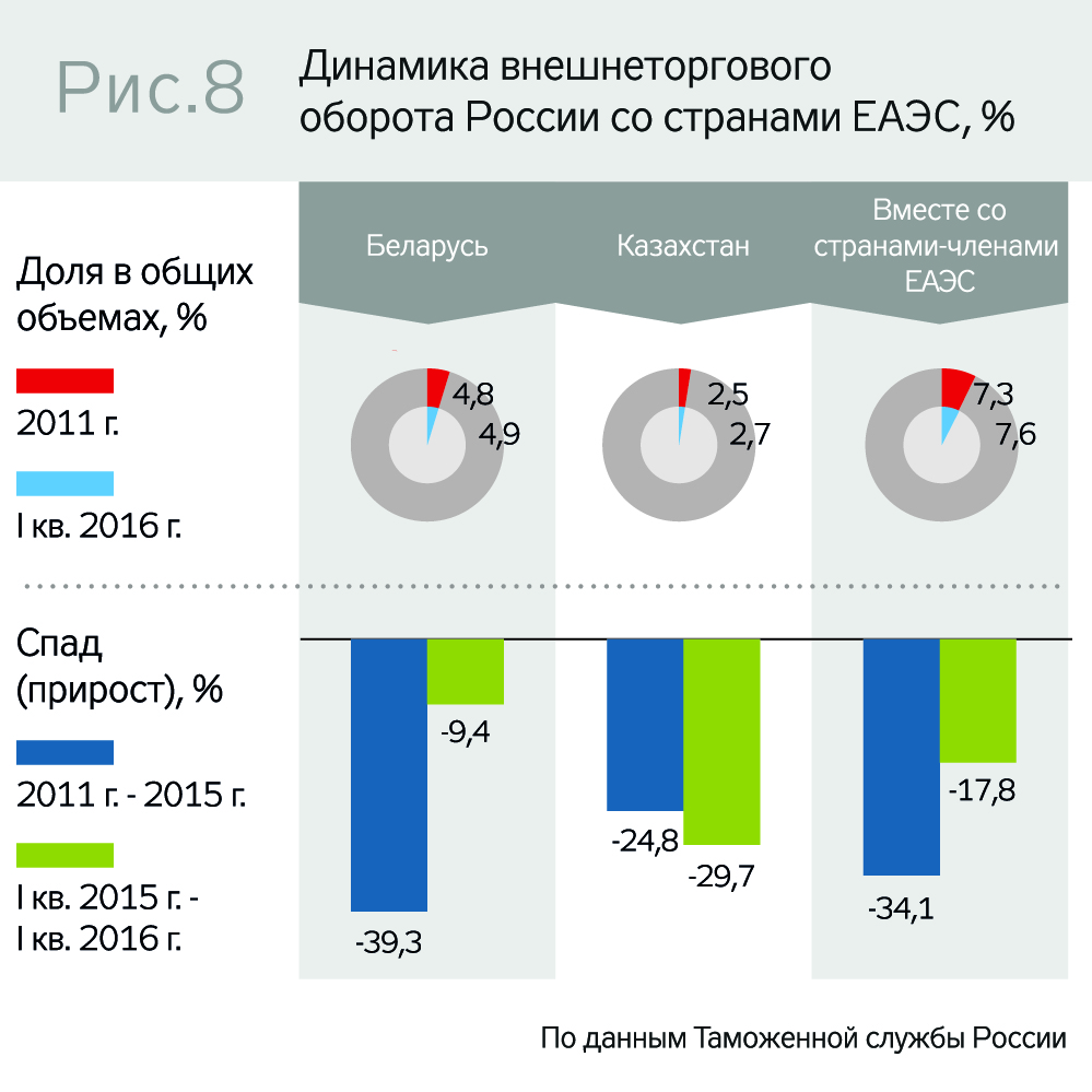Но самым существенным аргументом относительно оценки влияния санкций ЕС на российскую экономику является состояние внутренней торговли между странами Евразийского (бывшего Таможенного) союза. В режиме этой торговли санкций нет, но торговля падает, и довольно существенно: не менее, чем с ЕС. Об этом свидетельствует статистика. В частности, в 2015 г. по сравнению с 2011-м (началом функционирования Союза) товарооборот Беларуси с Россией сократился на 39,3%, Казахстана с Россией - на 24,8%, а в первом квартале 2016 г. - на 29,7%. При этом Евразийский экономический союз в не только не помогает России, наоборот - оказался для нее еще одним бременем.