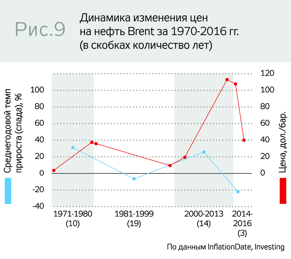 За последние 45 лет в мире было два цикла роста цен на нефть: 1971–1980 и 2000–2013 гг., и один цикл спада - 1981–1999 гг. В 2014 г. начался второй цикл спада цен на нефть. Исходя из предыдущего опыта продолжительности циклов, этот цикл может продлиться не менее 10 лет. Что за этим стоит - объективная закономерность циклов или крупные игры сильных мира сего? До сих пор не доказано. Как не доказаны и причины финансовых кризисов: что это - обычные просчеты финансистов, валютные игры банкиров или чьи-то сценарии?