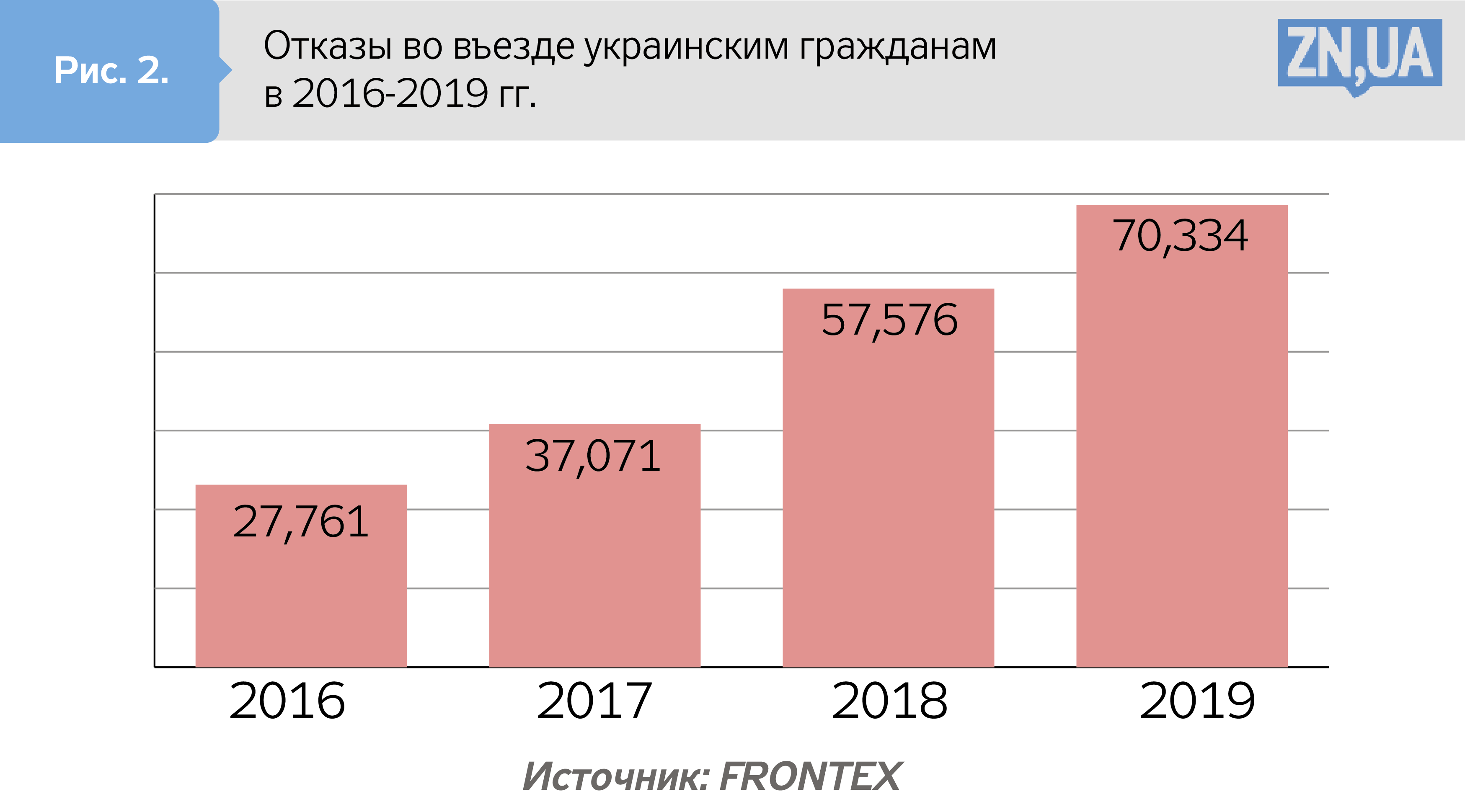 Украина возглавляет список стран происхождения лиц, выявляемых во время незаконного пребывания в ЕС, и поэтому не удивительно, что пограничники пытаются отфильтровывать потенциальных нарушителей еще на въезде. Так, среди граждан третьих стран украинцам чаще всего отказывали во въезде в Шенгенскую зону. Количество отказов составляет свыше 70 тысяч, что соответствует 30% всех отказов на внешних границах ЕС. При этом из года в год количество украинцев, которые не смогли попасть в Шенген, тоже растет.