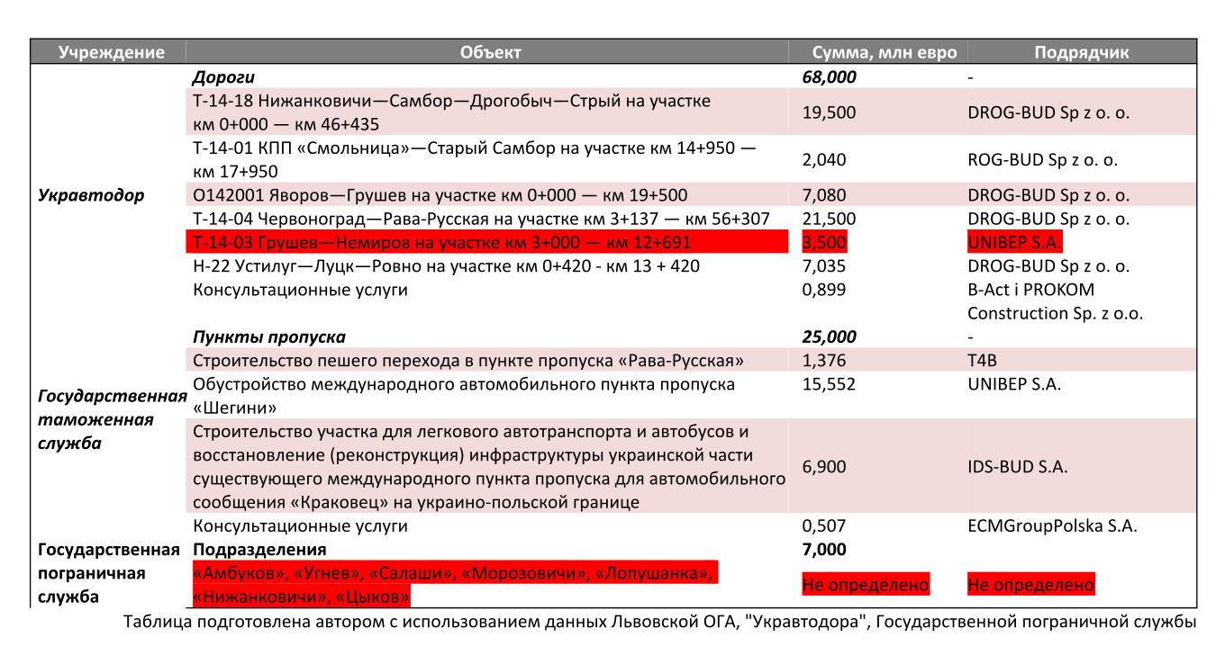 За годы работы над внедрением кредита сложилась следующая конфигурация: средства должны были быть разделены между тремя ведомствами и направлены на ремонт 1) дорог; 2) пунктов пропуска на украино-польской границе; 3) инфраструктуры пограничных отрядов (см. табл.).