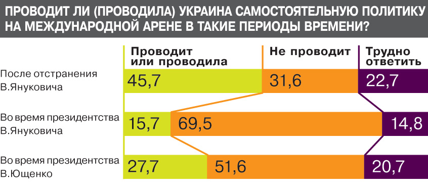 Оказывается, граждане Украины считают, что Революция достоинства создала для внешней политики Украины совершенно новые положительные возможности. 45,7% уверены, что сейчас Украина проводит самостоятельную политику на международной арене, треть опрошенных (31,6%) с этим не соглашаются. При этом 69,5% считают, что во времена президентства В.Януковича у Украины не было самостоятельной политики, с этим утверждением не соглашаются только 15,7%.