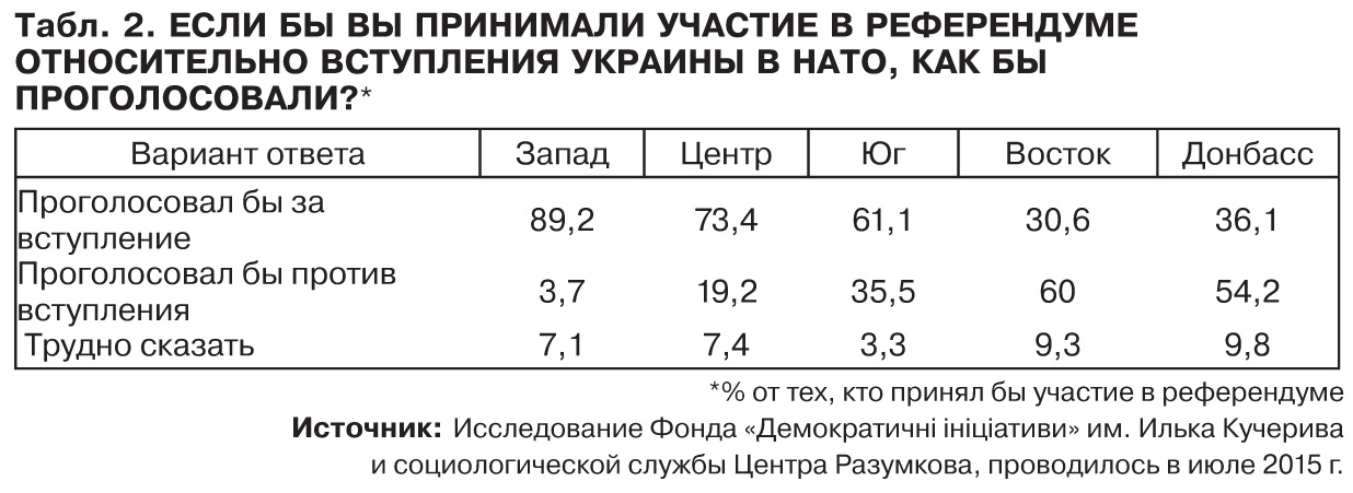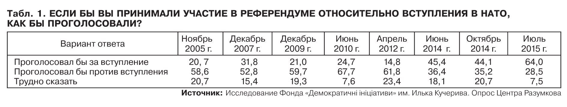 До 2014 г. одной из наиболее видимых линий "размежевания" общественного мнения были внешнеполитические ориентации украинцев. При этом, если рост поддержки евроинтеграции происходил медленно, но уверенно, то с уровнем поддержки членства в НАТО ситуация была иной. Так, симпатики членства Украины в альянсе были в абсолютном меньшинстве вплоть до 2014 г. В частности, на гипотетическом референдуме относительно присоединения Украины к альянсу количество тех, кто проголосовал бы "за", с 2005-го по 2012-й колебалось в пределах 15–32%. Кстати, самый высокий за последние 10 лет уровень поддержки НАТО - 32% - был зафиксирован в конце 2007 г. Возможно, на волне подготовки к Бухарестскому саммиту НАТО, соответствующей риторики тогдашних оранжевых сил. Самый низкий - 15% - в период "эры стабильности" режима Януковича - весной 2012 г. (см. табл. 1).