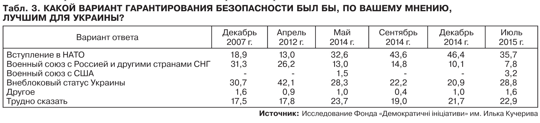 В 2014 г. НАТО впервые вышло в лидеры среди различных вариантов гарантирования национальной безопасности Украины. Так, если в 2012 г. гарантию безопасности для Украины в НАТО усматривали 13% украинцев, то в мае 2014-го - 33, а в декабре этого же года - 46%, хотя после этого и произошел спад до 36%.