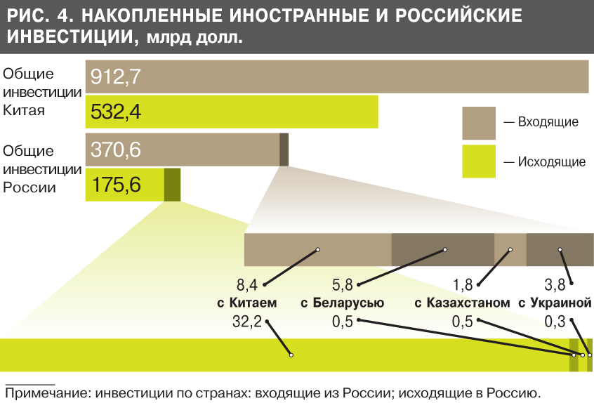 Следует также учесть, что Китай богат не только трудовыми, но и инвестиционными ресурсами. Россия, как и Украина, остро нуждается в инвестициях, однако наши две страны ничем друг другу особо помочь не могут. Другое дело Китай, общие исходящие инвестиции которого в 1,5 раза превышают общие входящие инвестиции России и в 20 раз - фактические вложения средств в нее. Китай способен полностью удовлетворить инвестиционные нужды России для полноценного освоения Сибири (рис. 4).
